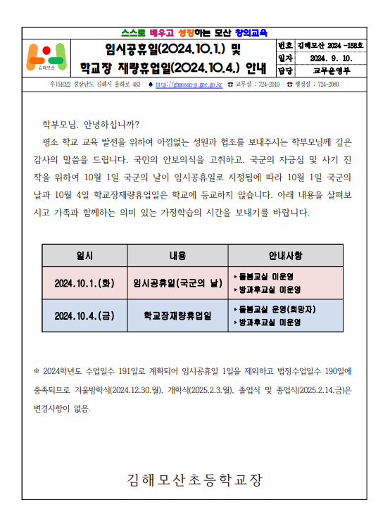 임시공휴일(2024.10.1.) 및 학교장재량휴업일(2024.10.4.) 안내